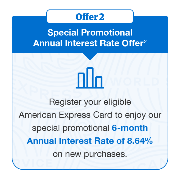Enjoy double privileges with your Card! From March 3 to 31, 2026, simply register your eligible American Express® Card to enjoy the complementary benefits of a statement credit PLUS a 6-month lower interest rate on new purchases. More financial freedom is at your fingertips.