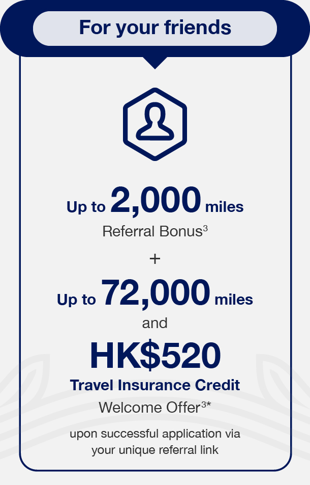 2,000 miles of referral bonus is only applicable for Basic Cardmembers who submit their Card application online and all required valid documents within 7 days from the date of application submission, and upon successful spending made with the Basic Card or Supplementary Card in the first 3 months of Basic Card approval. Mile conversion rate accurate as of May 2025 and on the basis of 1 mile can be redeemed by 18 Membership Rewards points. The HK$520 travel insurance credit is equivalent to the first-year full premium for the Greater Bay Area Annual Multi-Trip Travel Insurance - Basic Plan for Individuals (annual premium as low as HK$520 as of May 2025) or up to 40% savings for the Asia-Pacific Annual Multi-Trip Travel Insurance - Basic Plan for Individuals (annual premium as low as HK$1,270 as of May 2025). For details of the Insurance Welcome Offer, please visit go.amex/mgmiis25en. Welcome Offers Terms and Conditions apply.