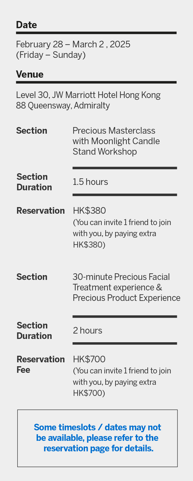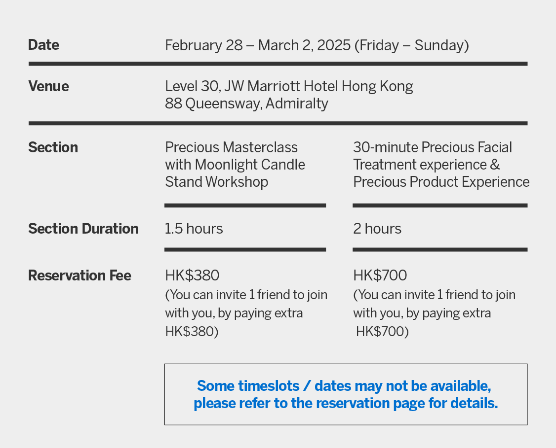 As The Platinum Card Member, you are invited to join us at this exclusive event for a Precious experience. You can receive a complimentary Essence of Time Experience Set (valued at HK$369) and enjoy exclusive shopping privileges upon completion of the event.