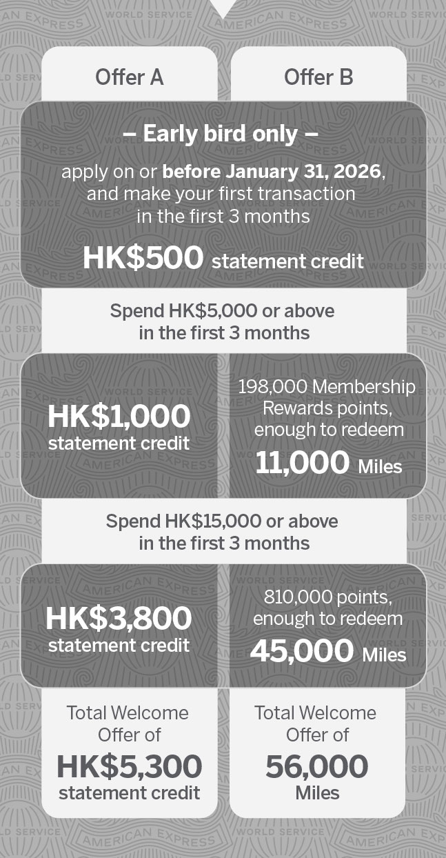 We treasure your support of American Express. To welcome the new year, here’s an invitation with the limited time offer of up to HK$10,600 or 101,000 miles when you apply for The Platinum Card. For an annual fee of HK$9,500, you’ll enjoy an array of new benefits that make travel easier and more rewarding all year round.