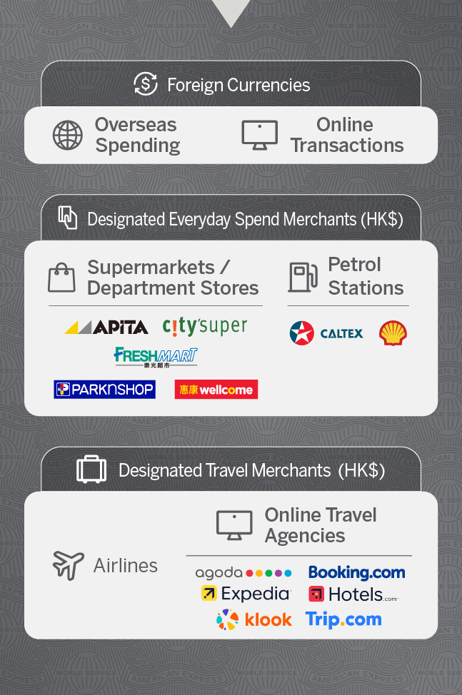 From now to December 31, 2025, ensure you’re enrolled with your Platinum Card®^12 to enjoy additional rewards. Earn as low as HK$2 = 1 Mile^7 on foreign currencies^3, designated travel merchants^4, and designated everyday spend merchants' expenses^56.