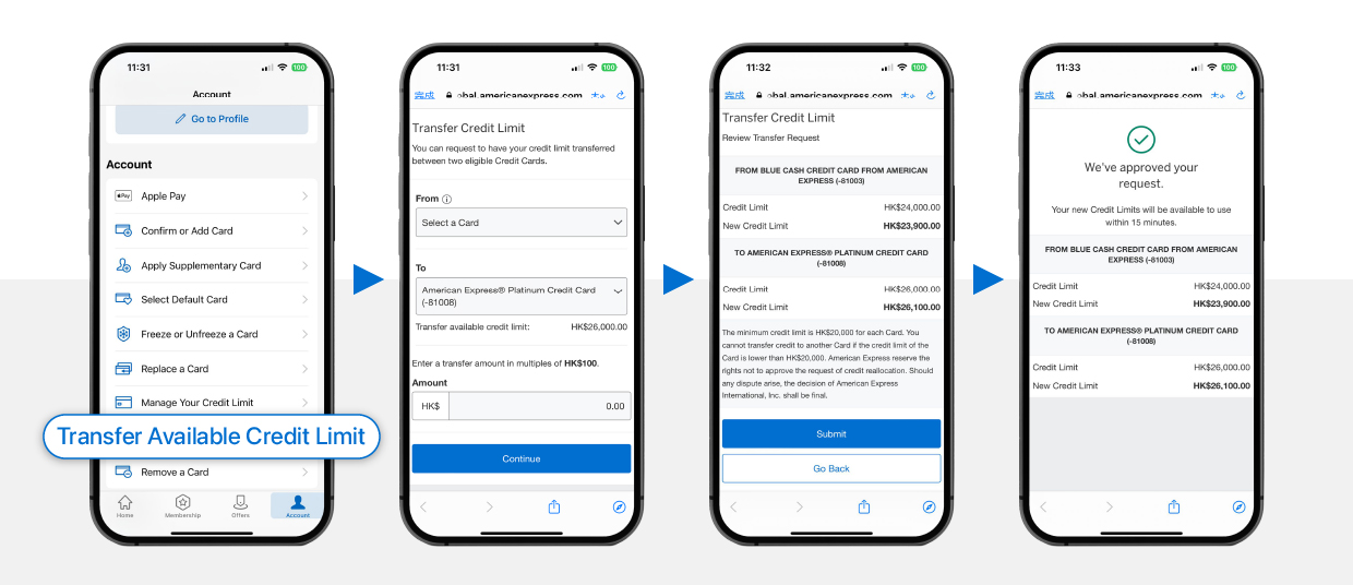 You cannot transfer credit to another Card if the credit limit of the Card is lower than HK$20,000. Cardmember Agreement and KFS statement apply. American Express reserves the right to approve or decline the application without giving any reason or prior notice.