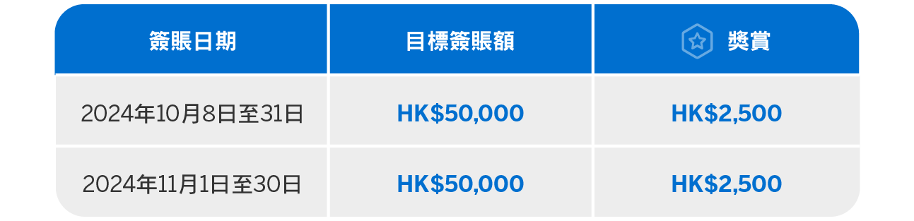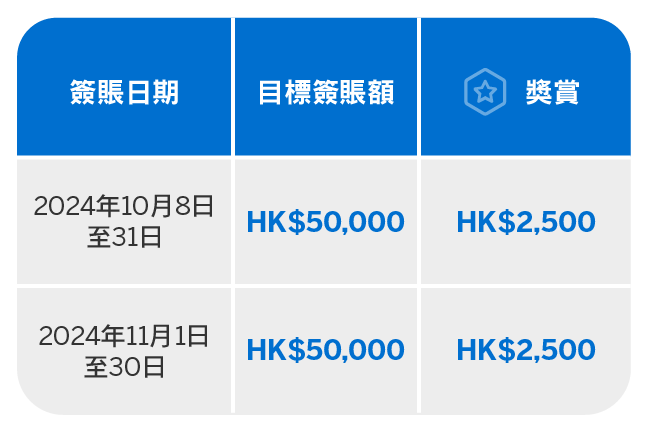 由2024年10月8日至11月30日,您只需憑已登記之美國運通商務卡累積簽賬並達以下目標簽賬額,即可獲享簽賬回贈*。