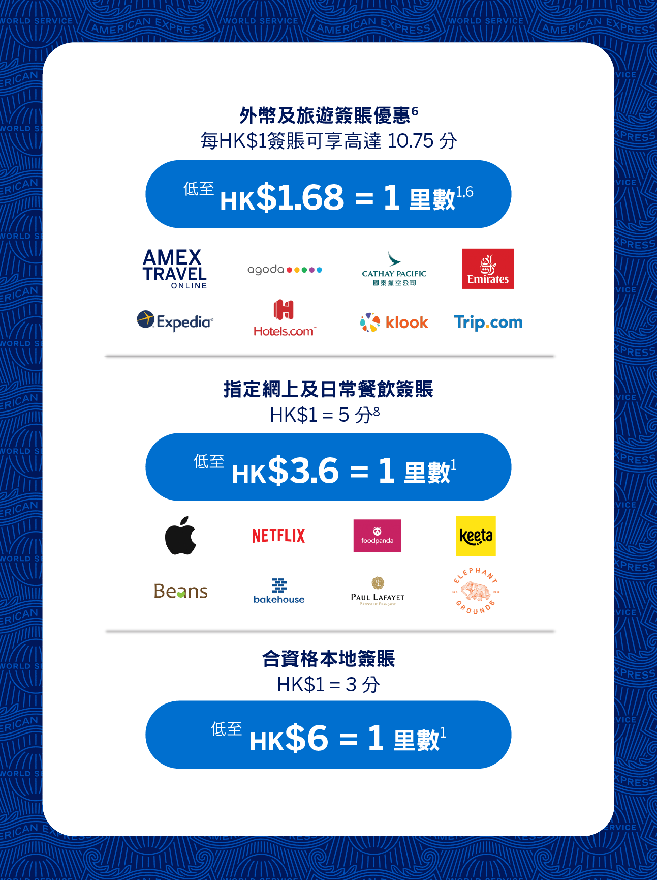 兌換率乃依據2025年3月計算,以18,000美國運通積分兌換1,000飛行里數、以30,000積分兌換HK$100現金券及以3,000積分兌換HK$10 Pay with Points計算。 |