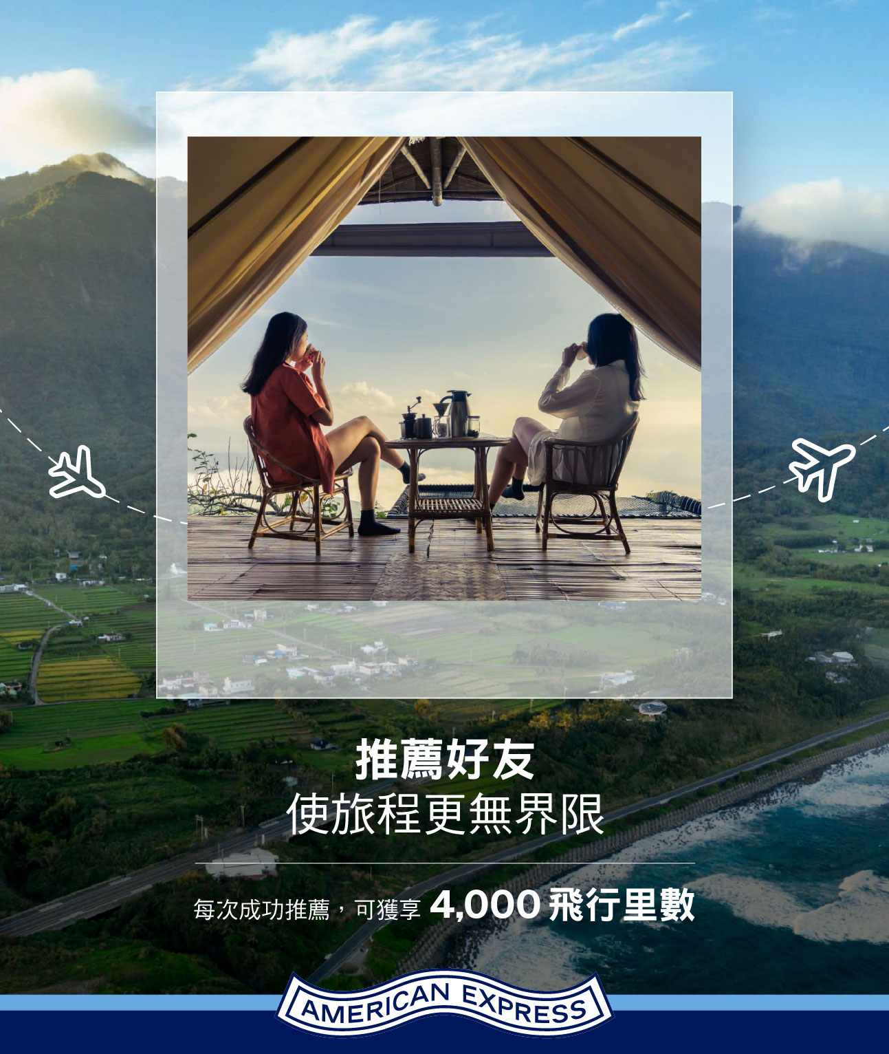 成功推薦全新卡會員申請美國運通Explorer®信用卡,您可獲享 72,000美國運通積分1,相等於4,000飛行里數2,讓您的下一趟旅程更寫意! 請把握機會成功推薦10位好友,累積高達40,000里3!