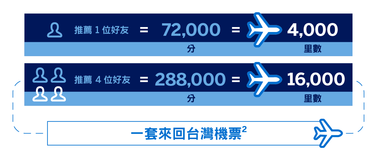 兌換率乃依據2025年10月及以18美國運通積分兌換1里數計算及以14,000「亞洲萬里通」里數兌換一套來回台北經濟艙機票計算。兌換率乃依據2025年10月之飛行獎勵標準賞,實際所需里數可能有變,奬勵機票須視乎當時供應情況而定。 |