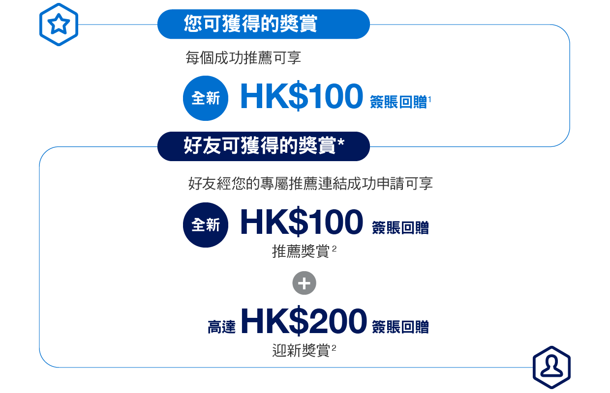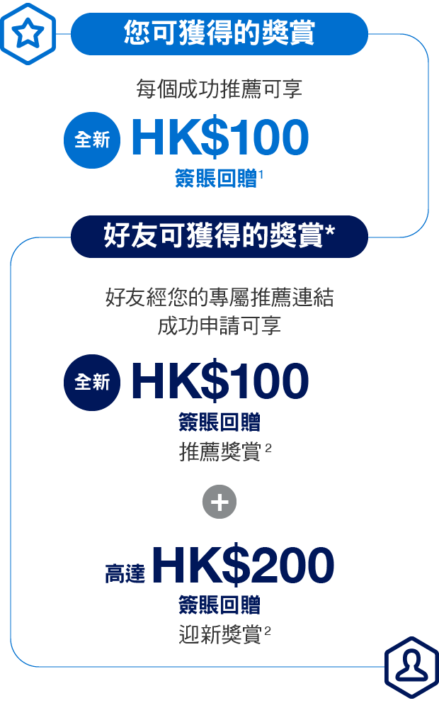 HK$100簽賬回贈推薦計劃獎賞只適用於透過網上申請並於遞交申請表之7個工作天內提交所有所需有效文件之成功批核的基本卡會員。高達HK$200簽賬回贈迎新獎賞以基本卡批核日起首2個月內,以其基本卡及/或附屬卡累積簽賬滿HK$2,000或以上計算。須受迎新優惠條款及細則限制。