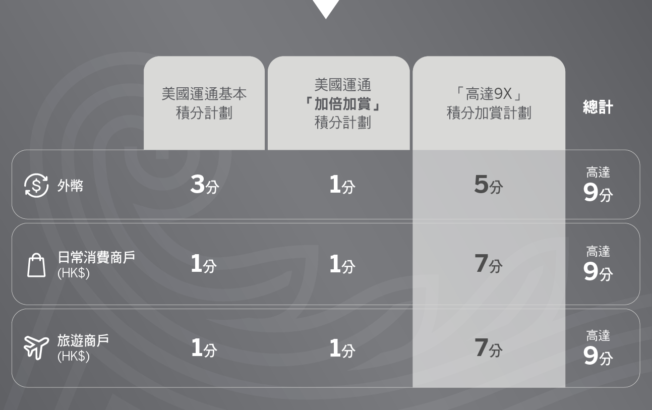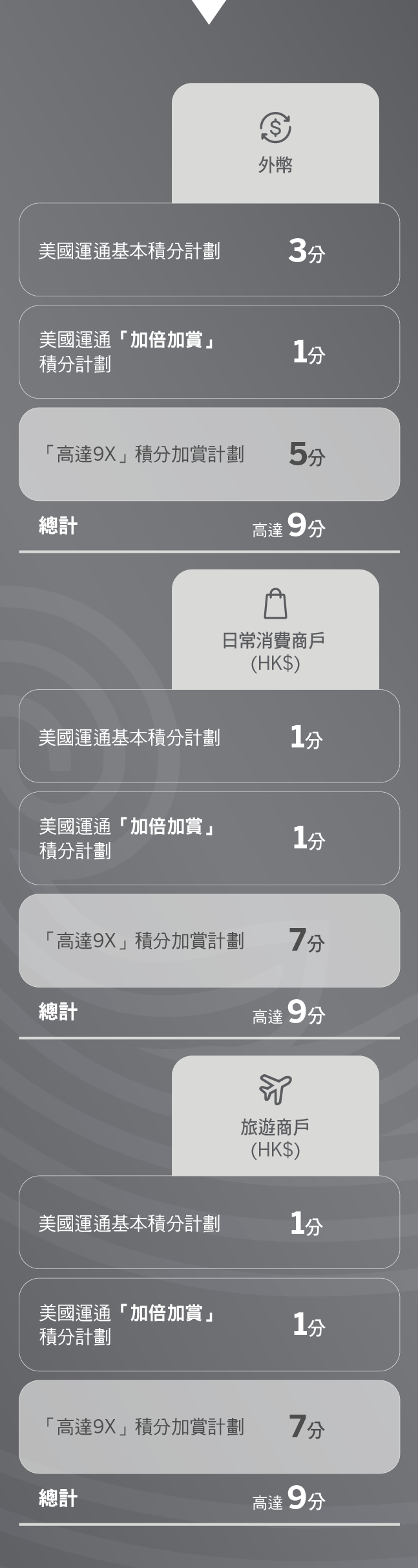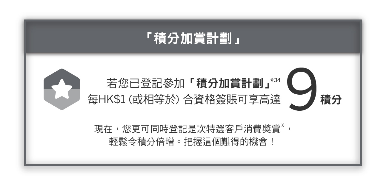 成功完成登記積分加賞計劃後,憑已登記卡於每個曆年季度內(即2025年8月20日至9月30日或2025年10月1日至12月31日)憑已登記合資格卡可於以下簽賬獲額外最多9 美國運通積分(低至 HK$2 = 1 里):(i) 外幣簽賬首等值 HK$15,000之已過賬至已登記合資格卡賬戶之簽賬、(ii) 於「指定旅遊商戶」之首 HK$15,000 已過賬至已登記合資格卡賬戶之簽賬、以及(iii) 於「指定日常消費商戶」之首 HK$15,000 已過賬至已登記合資格卡賬戶之簽賬。須受條款及細則限制,請按此了解更多詳情。 |