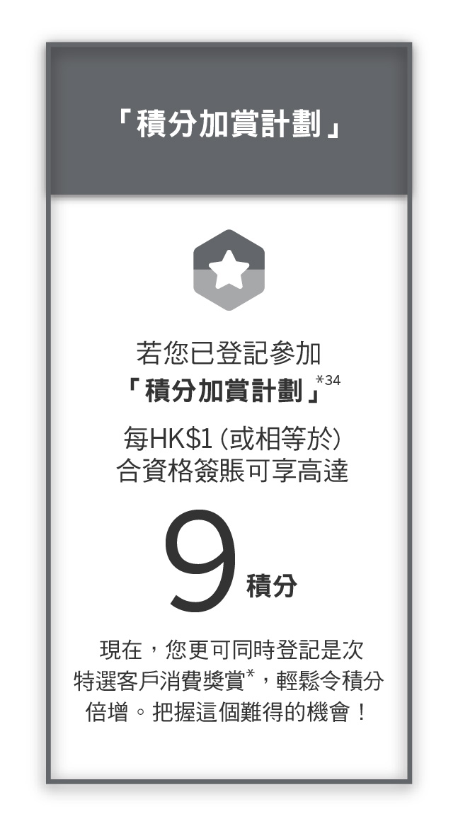 積分加賞計劃適用於由美國運通國際股份有限公司(「美國運通」)於香港簽發的美國運通白金卡(「合資格卡」)(「合資格卡會員」)。美國運通半島白金卡不適用於本計劃。為避免爭議,每個基本卡賬戶及賬戶名下之附屬卡將被視為一個合資格卡賬戶以計算總合資格簽賬額。 |
